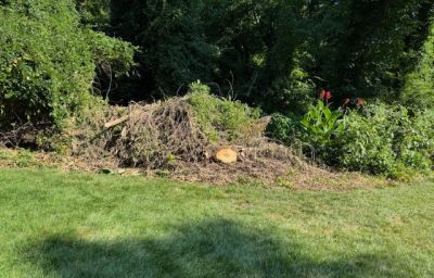 On Thursday evening, July 19th, a strong storm with heavy rain and winds occurred in our area. A bolt of lightning struck a pair of trees at the edge of the Common Area (C/A) on the west side of the bridge entrance. Two trees were felled by the strike, with one falling onto the Common Area grounds that are mowed, bringing down lots of vines and other brush debris. Within a couple days, President Mitch worked with a company to clean the C/A and remove debris back to the wood's edge. He also arranged with another company additional work needed to complete the cleanup and restore the Common Area.